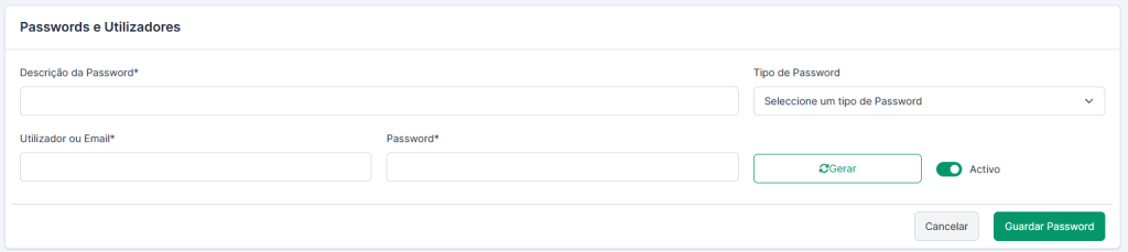 Este módulo serve como gestor centralizado de credenciais, permitindo armazenar, editar e consultar acessos (passwords) associados a diferentes utilizadores, emails ou serviços da empresa. Útil para equipas que partilham contas, acessos técnicos, sistemas externos ou plataformas online.