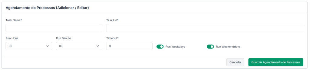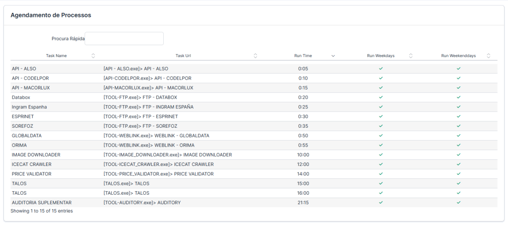 Este módulo permite agendar a execução automática de tarefas e ferramentas externas (como .exe, scripts ou ferramentas internas). É utilizado para garantir que tarefas importantes, como sincronizações via API, downloads de ficheiros, crawlers ou validações, sejam executadas nos horários certos e de forma consistente.