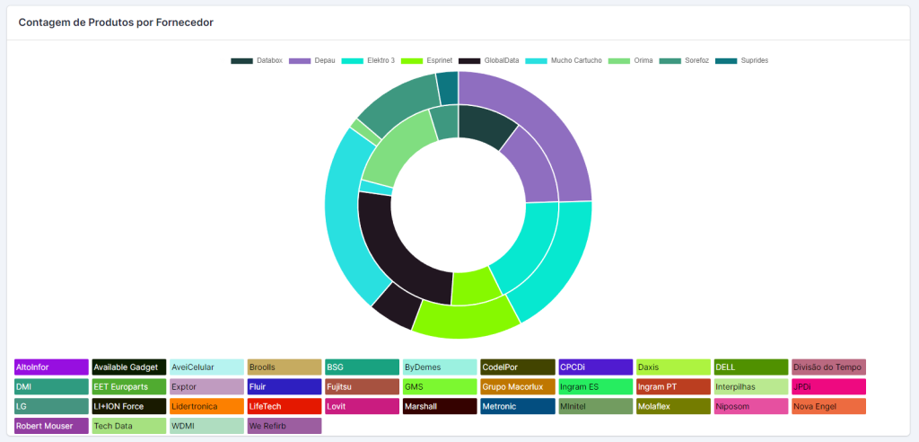 Gráfico de rosca (donut) | Dividido em segmentos coloridos, cada um representa um fornecedor. O tamanho indica a proporção de produtos atribuída a esse fornecedor. |