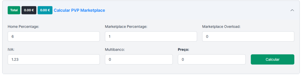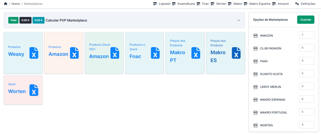No topo, está disponível o botão “Calcular PVP Marketplace”, que processa os ficheiros gerados com base nas margens, comissões e regras específicas de cada plataforma.