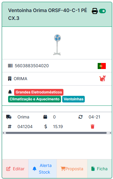- Ícones de ação rápida como: editar, alertar stock, gerar proposta ou abrir ficha detalhada.