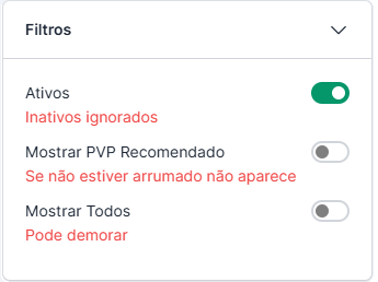 - Permite combinar os três para uma filtragem mais específica dos produtos visíveis.