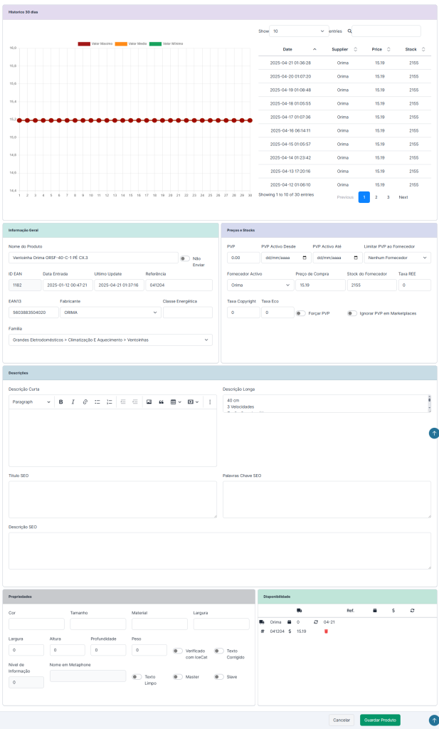 - Nome, EAN, marca, origem e categorias.